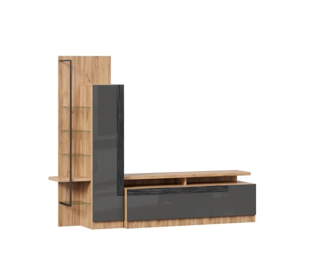 - Модуль скомбинирован из шкафа с открытыми и закрытыми полками, тумбы и полки под ТВ.