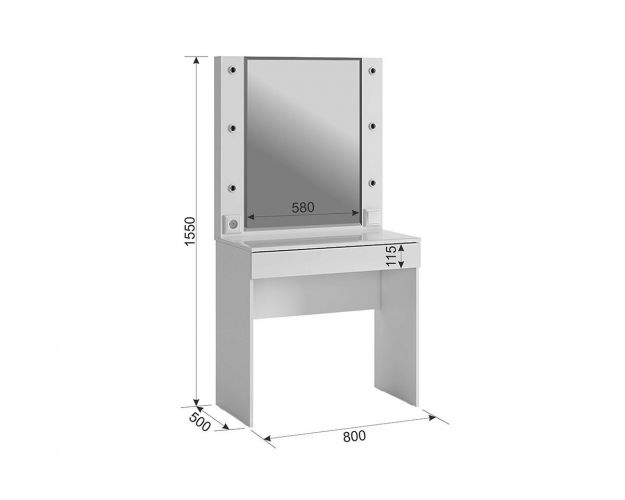 Трюмо Гламур спроектировано, чтобы удовлетворить потребности современной юной леди. С широким зеркалом, яркой подсветкой и просторным ящиком для аксессуаров, это трюмо идеально подходит для каждодневного использования. Дополнительный функционал в виде розетки позволяет без проблем подключить фен или другую косметическую технику. А удобные патроны для ламп, выключатель и длинный провод делают его еще более практичным. Стоит отметить, что лампы в комплектацию не включены.